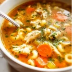 A comforting and easy chicken soup recipe loaded with tender chicken, hearty vegetables, and ditalini pasta – perfect for chilly days or a cozy family meal.