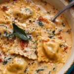 A comforting one-pot soup featuring savory Italian sausage, cheese ravioli, sun-dried tomatoes, and a creamy broth, perfect for chilly nights.
