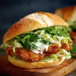 - Assemble Your Sandwiches: Slice the baguettes, spread the reserved Caesar dressing, layer in the crispy chicken, add the romaine salad, and finish with more Parmesan. Serve immediately with your choice of fries or salad.