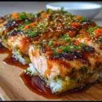 You’ll cook and season sushi rice, mix diced salmon with a creamy spicy mayo, layer it over the rice, and bake until the top sets and edges get lightly golden. It’s essentially sushi flavor in casserole form: rice base, seasoned fish topping, then garnishes for crunch and umami.