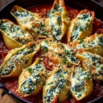 A comforting dish of jumbo pasta shells filled with creamy ricotta and fresh spinach, perfect for weeknight dinners or casual gatherings.